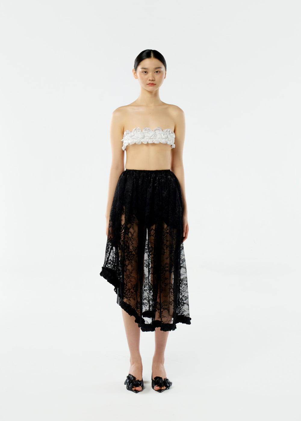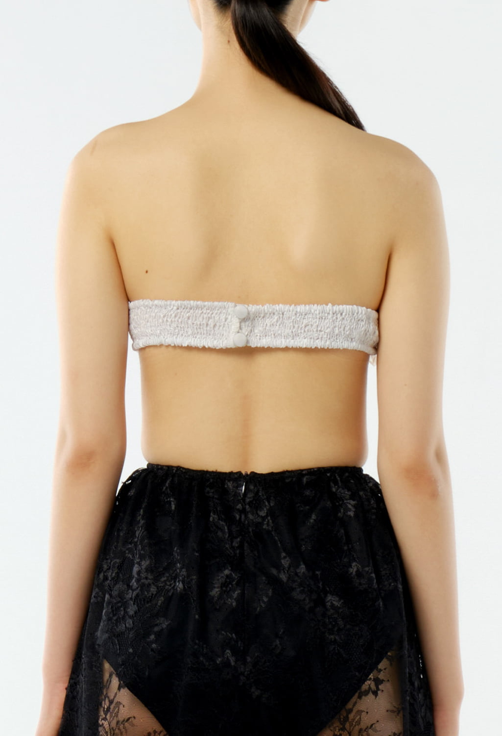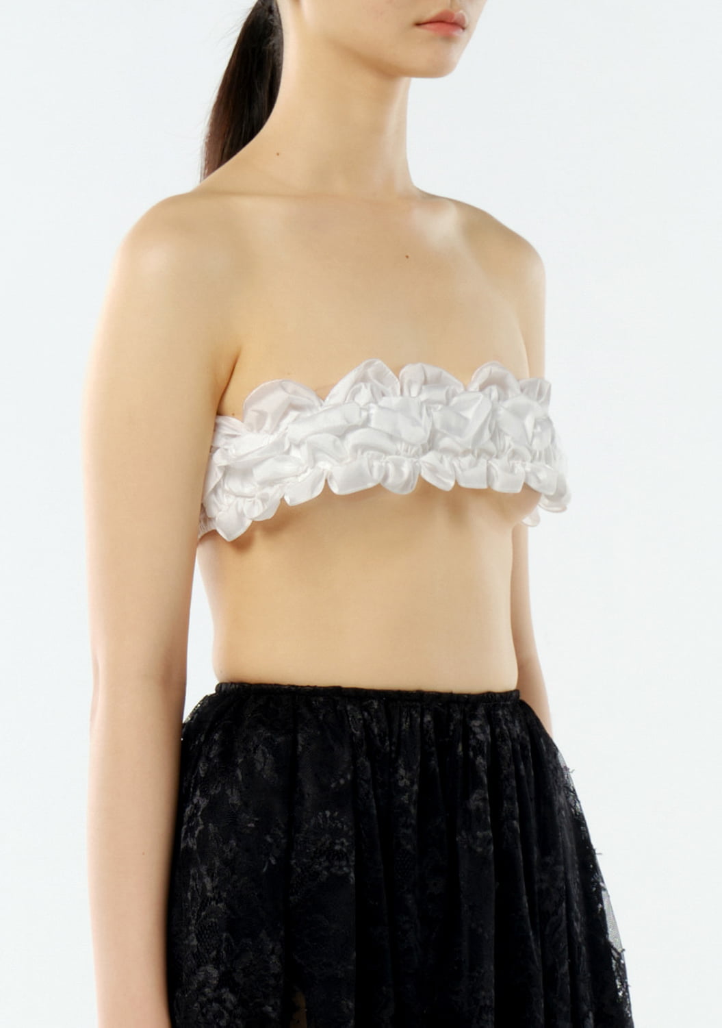 Tafetta scalloped ruffles bralette with elastics and covered buttons for opening.