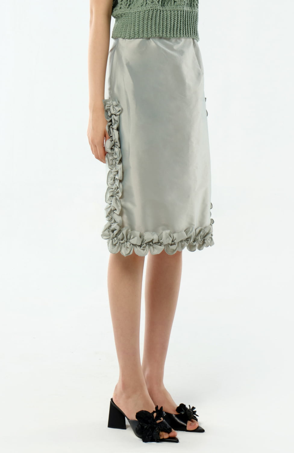 Tafetta Basic straight skirt with scalloped ruffles on the side and hem. Featuring side pockets and invisible back zip opening.